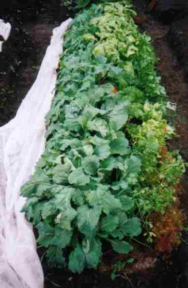 January King cabbages to the left, perpetual spinach centre back, carrots (invisible in this picture?) centre front, and various salad right: we learn from our mistakes - this is all planted too close together and not thinned!